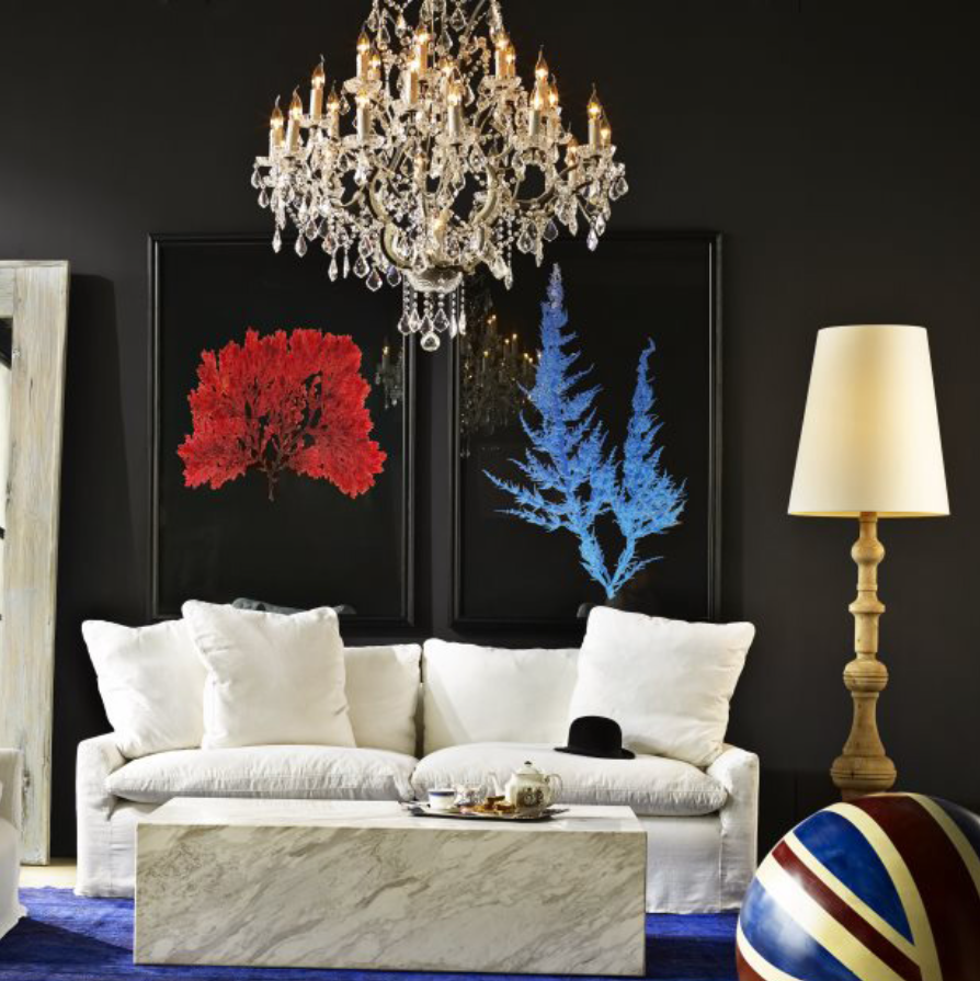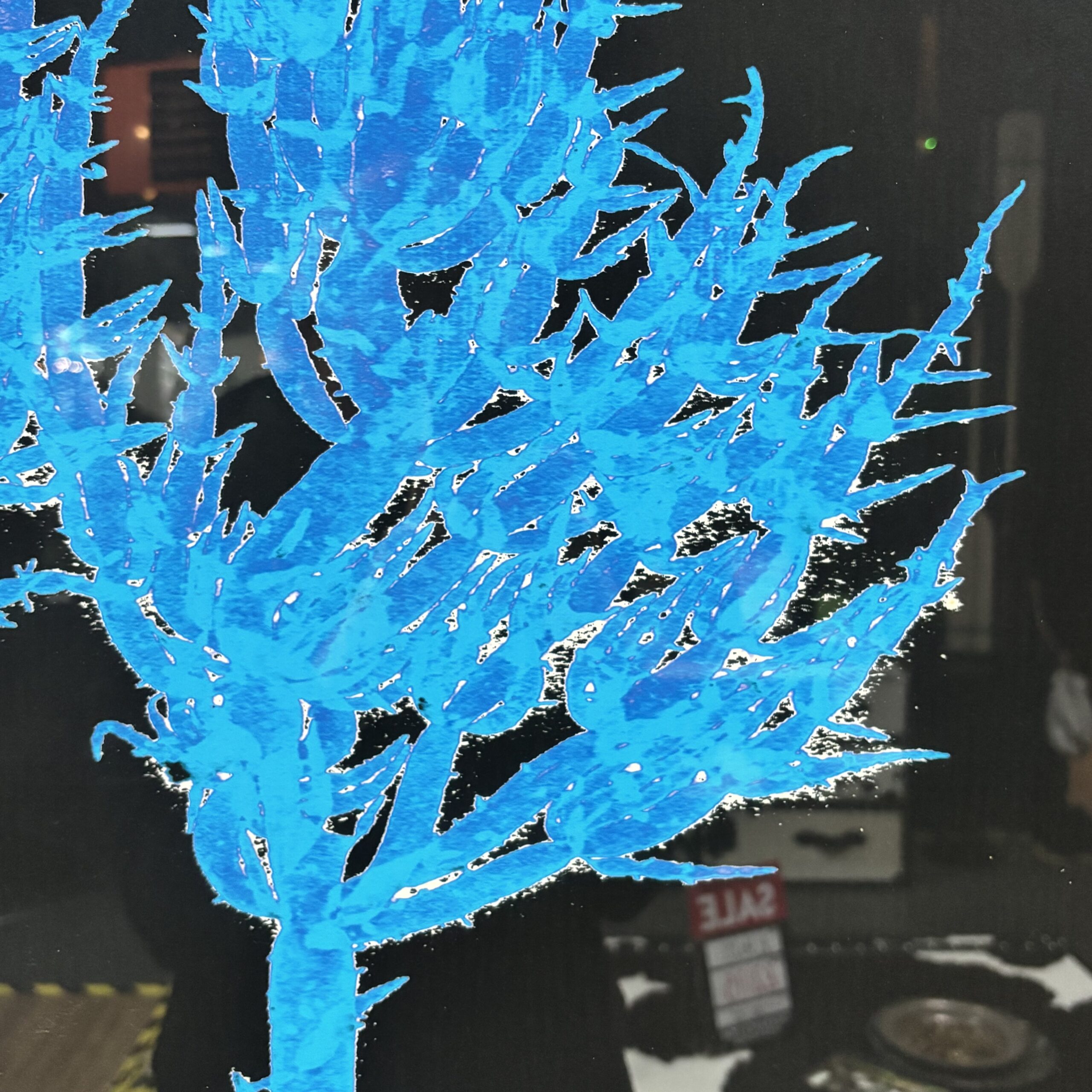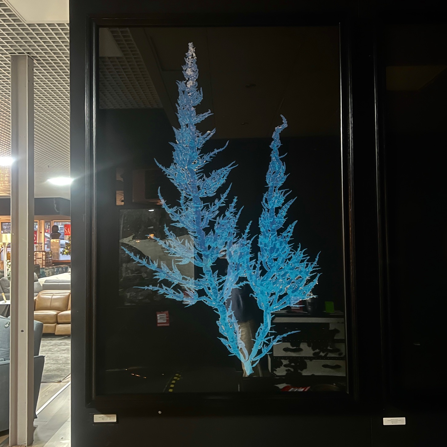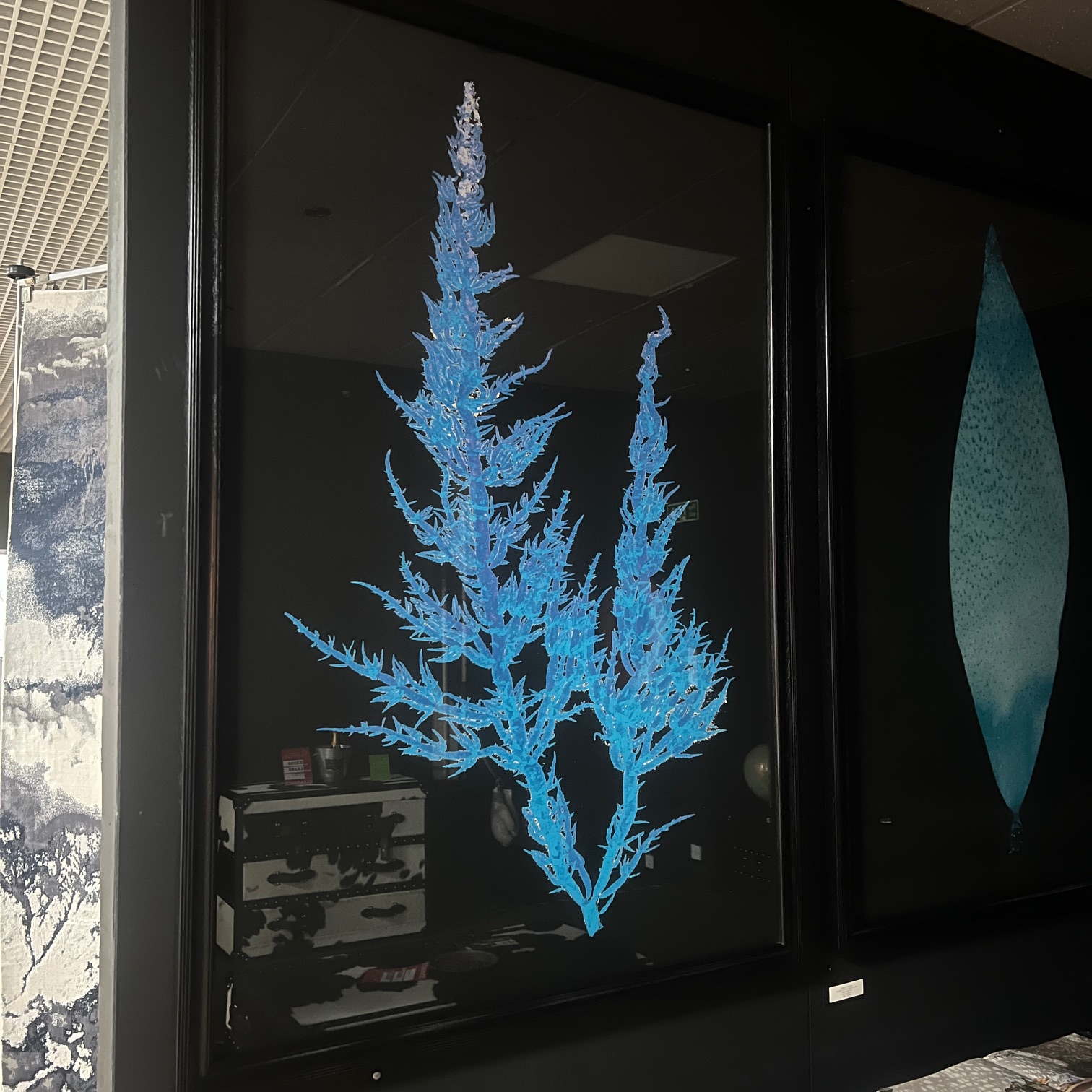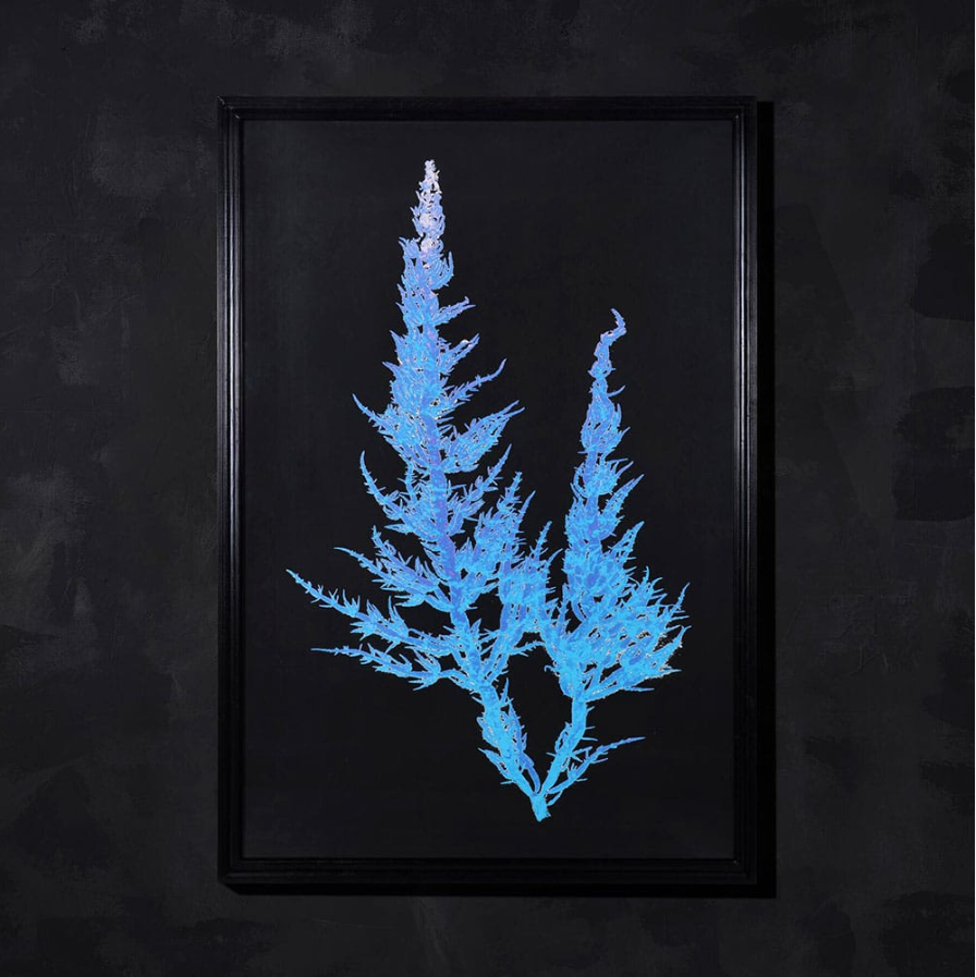 The vibrant colours of red, blue and orange present a striking contrast against the black background, rather like the dark stillness of the ocean.
