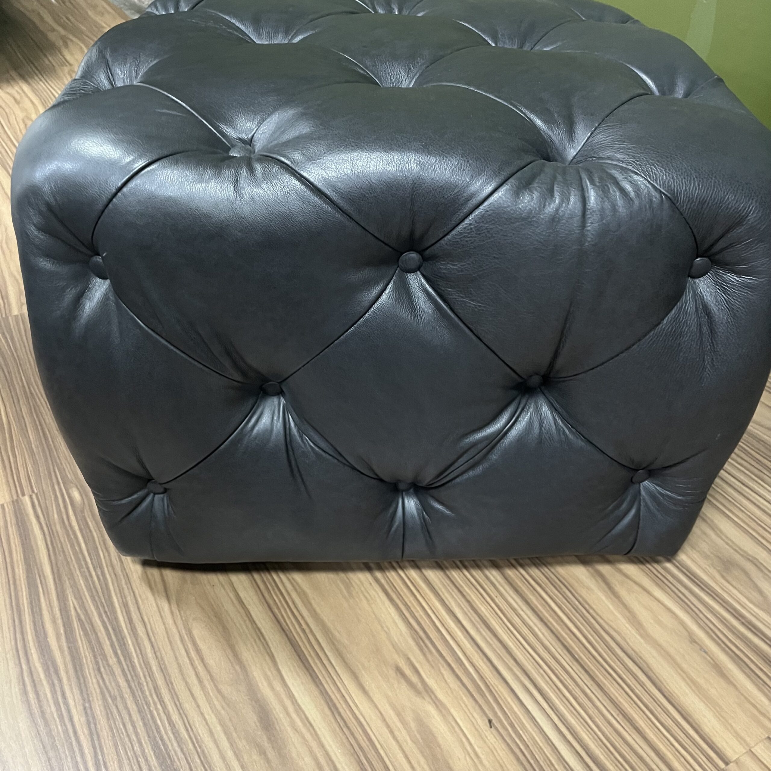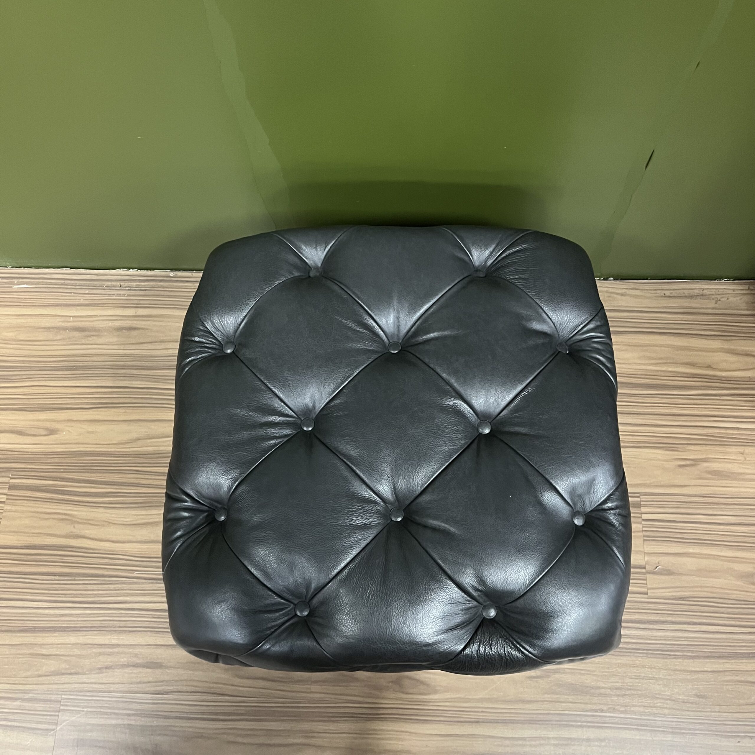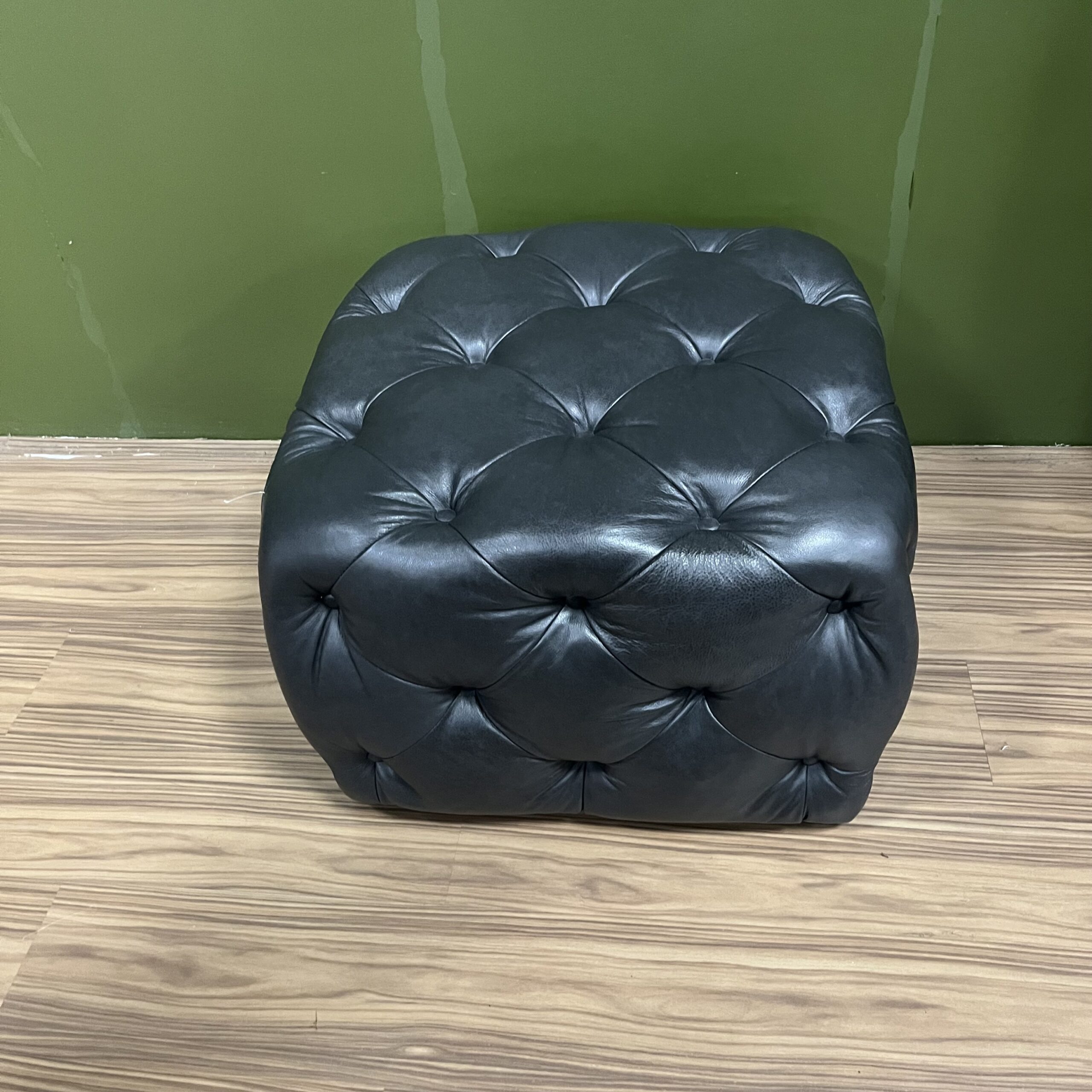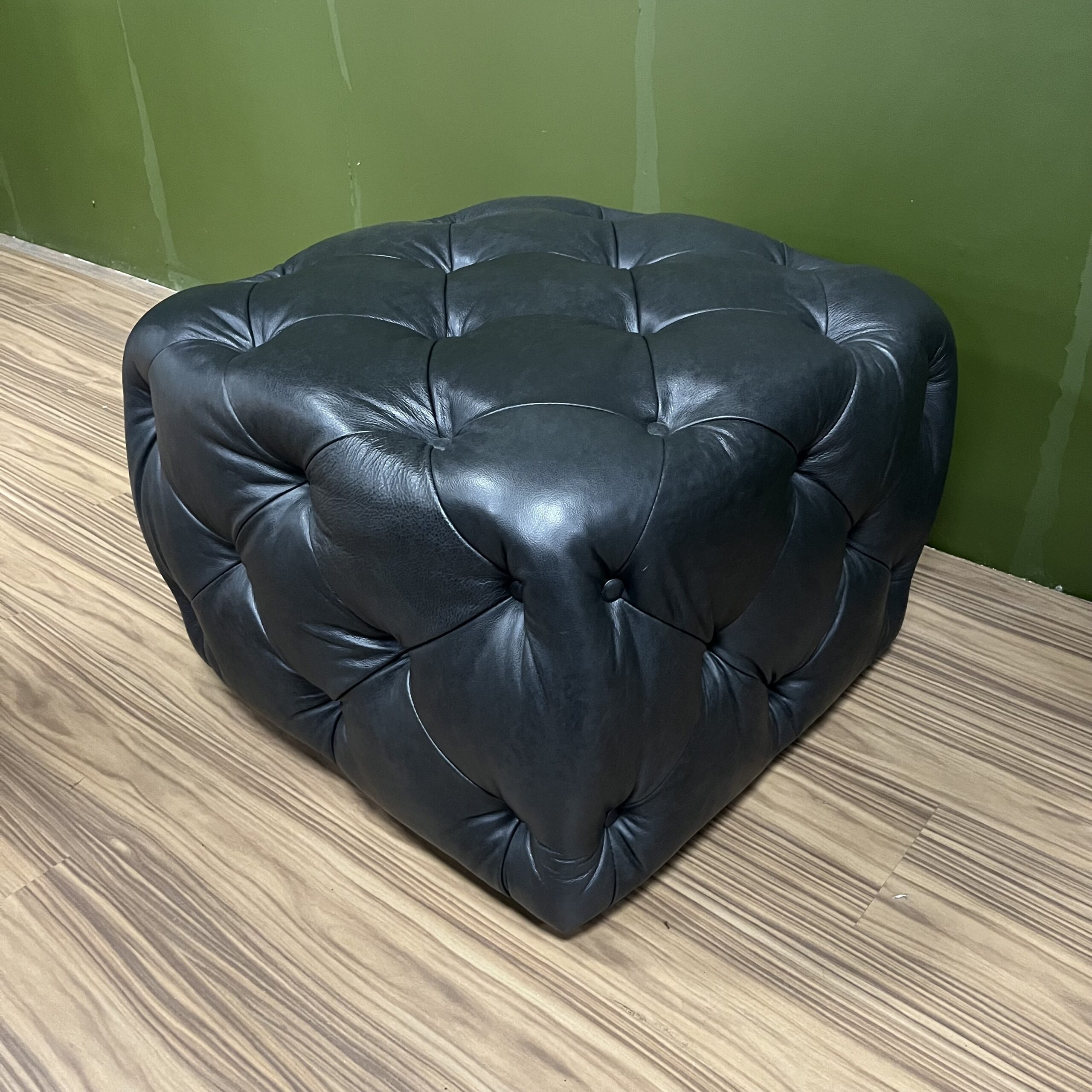Alexander & James Button Stool Small in Tote Night Leather. Deep buttons all over, and tufted by hand, this is a super versatile piece for anywhere in the home, whether a larger stool in the lounge, or a compact piece in the bedroom.