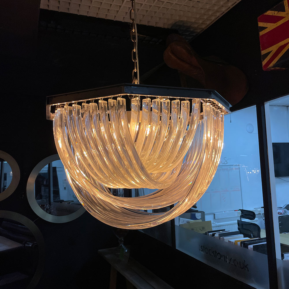 The curved shapes are achieved through extruding the glass through a hollow die, a process invented in the 1800s. A bold and captivating way to add sparkle and glow to a room.