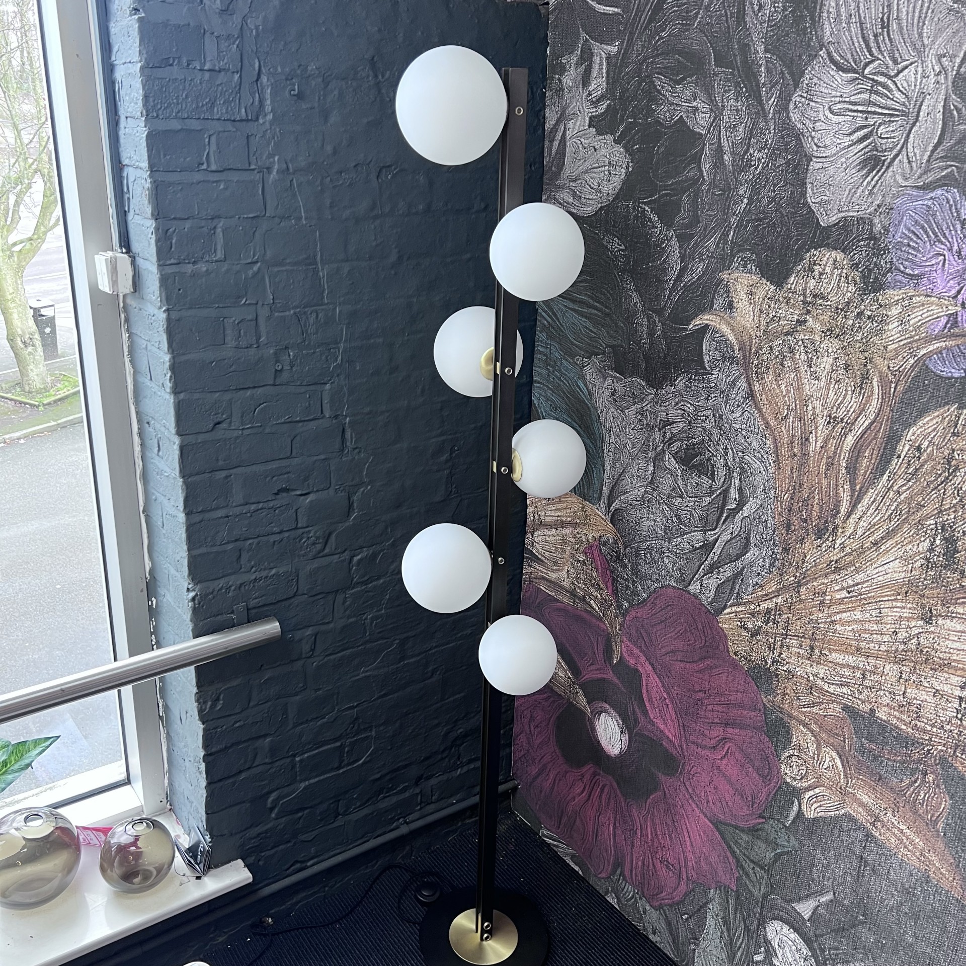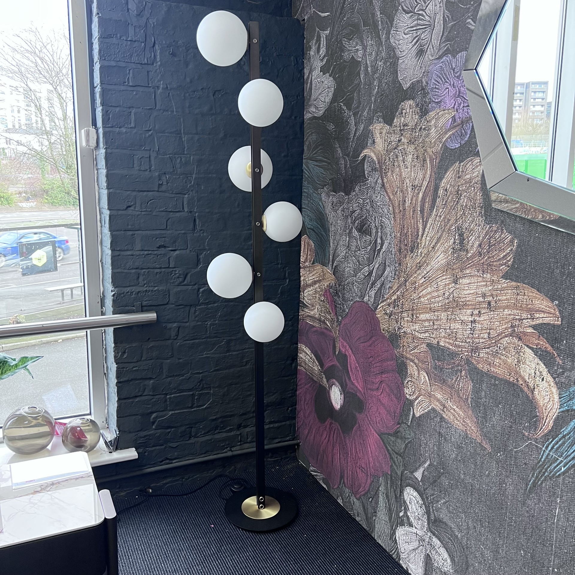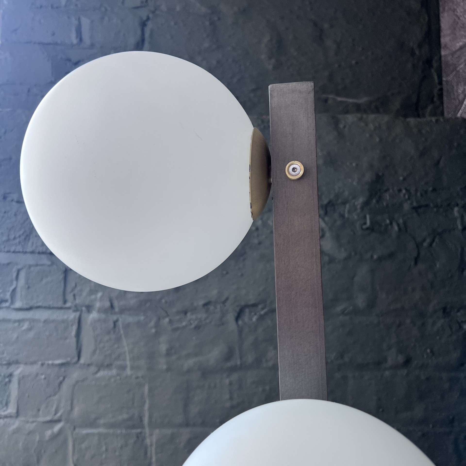 Cattelan Italia Planeta Floor Lamp The Planeta modern ceiling lamp family is conceived from an idea of Studio Kronos, drawing inspiration from 1960s design. The glass lampshades revolve around the burnished steel frame like a miniature planetary system. With its finely selected brushed brass details and the high-quality manufacturing of the white blown glass, this modern lamp is a piece of designer furniture that gives a refined allure to any room. The Planeta family includes a designer floor lamp and a ceiling lamp version, a wall light and a modern table lamp. Dimensions: 37 x 36 x 189 h cm Finish : Burnished Steel & Brass with Blown Glass Shade White DISPLAY MODEL Condition : Good Scratch to Base (see images)