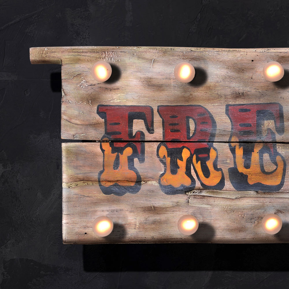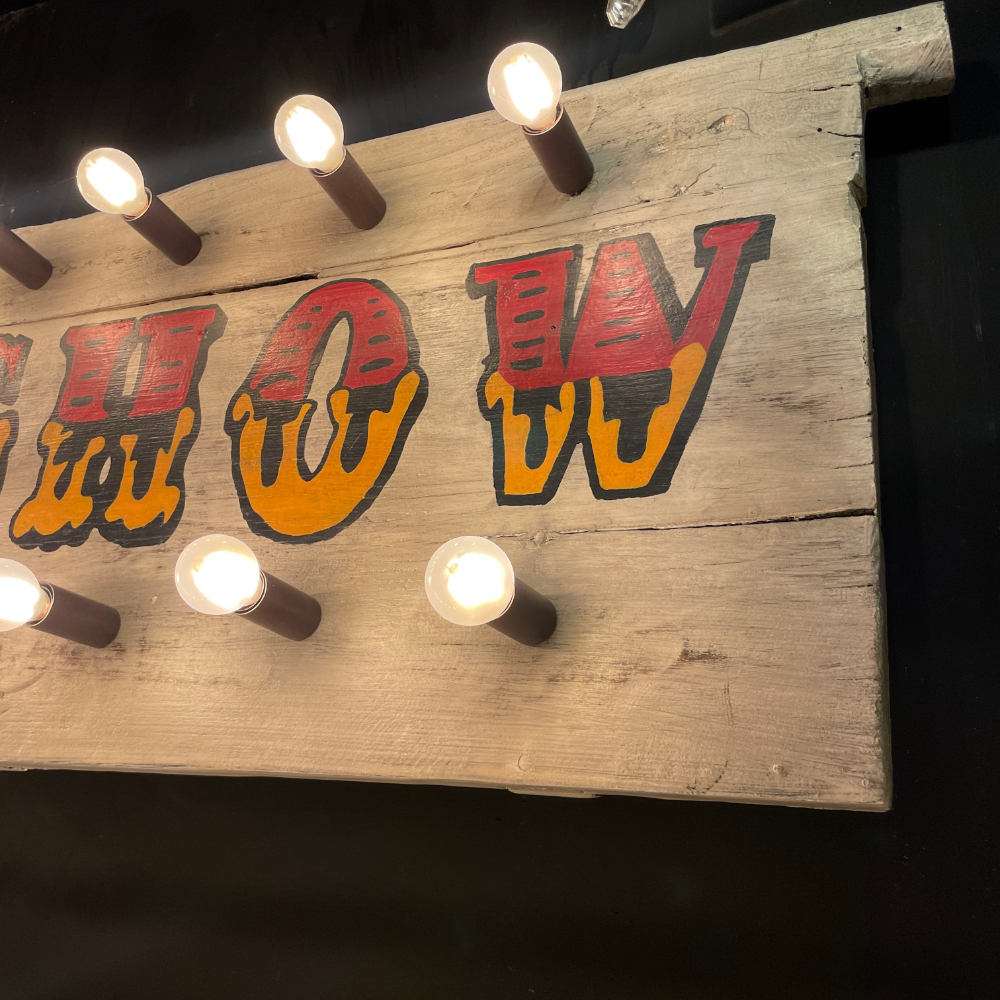 These unique circus signs are a nostalgic bow to the showmanship of 1920s funfairs. The design is painted by hand onto an old salvaged door, with all the bolt holes kept in and the weathered character preserved, as a testament to its rich provenance.