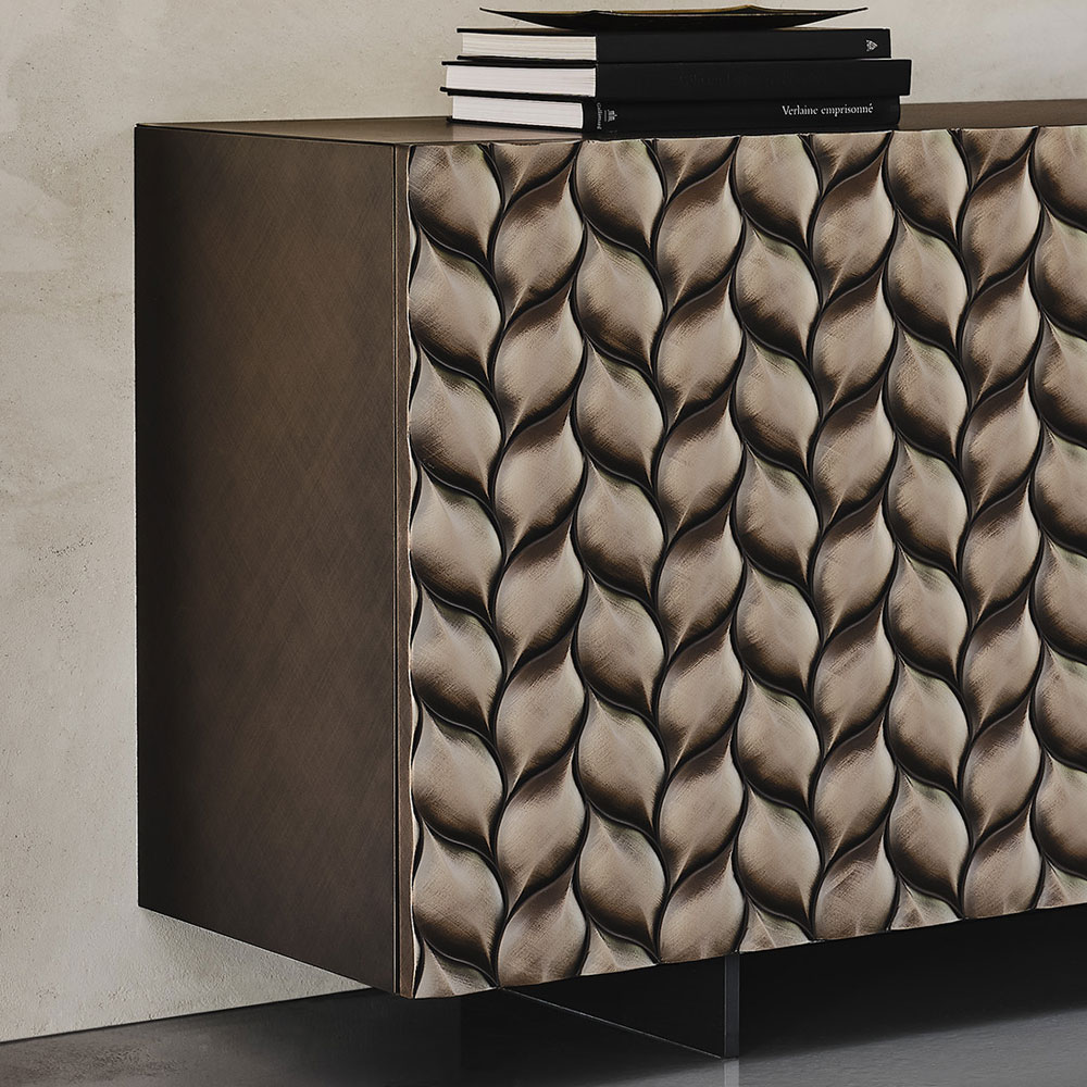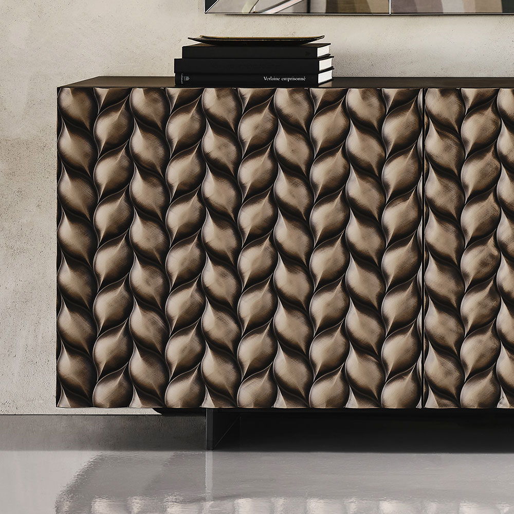 The Lavander modern sideboard has a strong three-dimensional nature. The doors decoration enhances the metallic lacquered finish, creating a pattern of sharp lights and shadows. The irregular yet silky surface has a satisfying feeling when passing the hand over the doors. This modern cabinet owes its sophisticated style to the excellent Italian manufacture which crafts exquisite details and finishes. The sculptural taste of this elegant sideboard is conceived to decorate convivial spaces of refined homes, hotels and restaurants.
