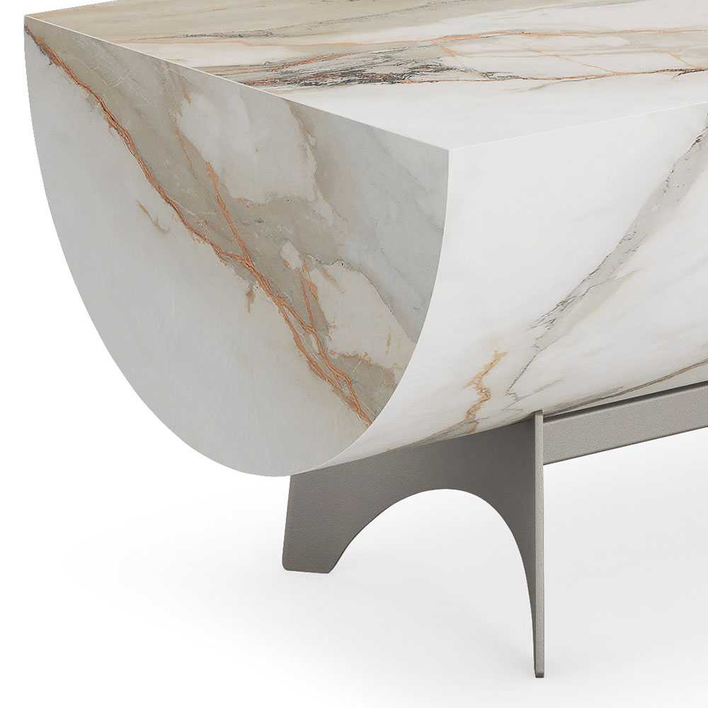 Coffee table in ceramic Marmi matt Portoro (KM07), matt Borghini Calacatta (KM18) or Colosseo (KM21). Base in titanium (GFM11) or bronze (GFM18) embossed lacquered steel.