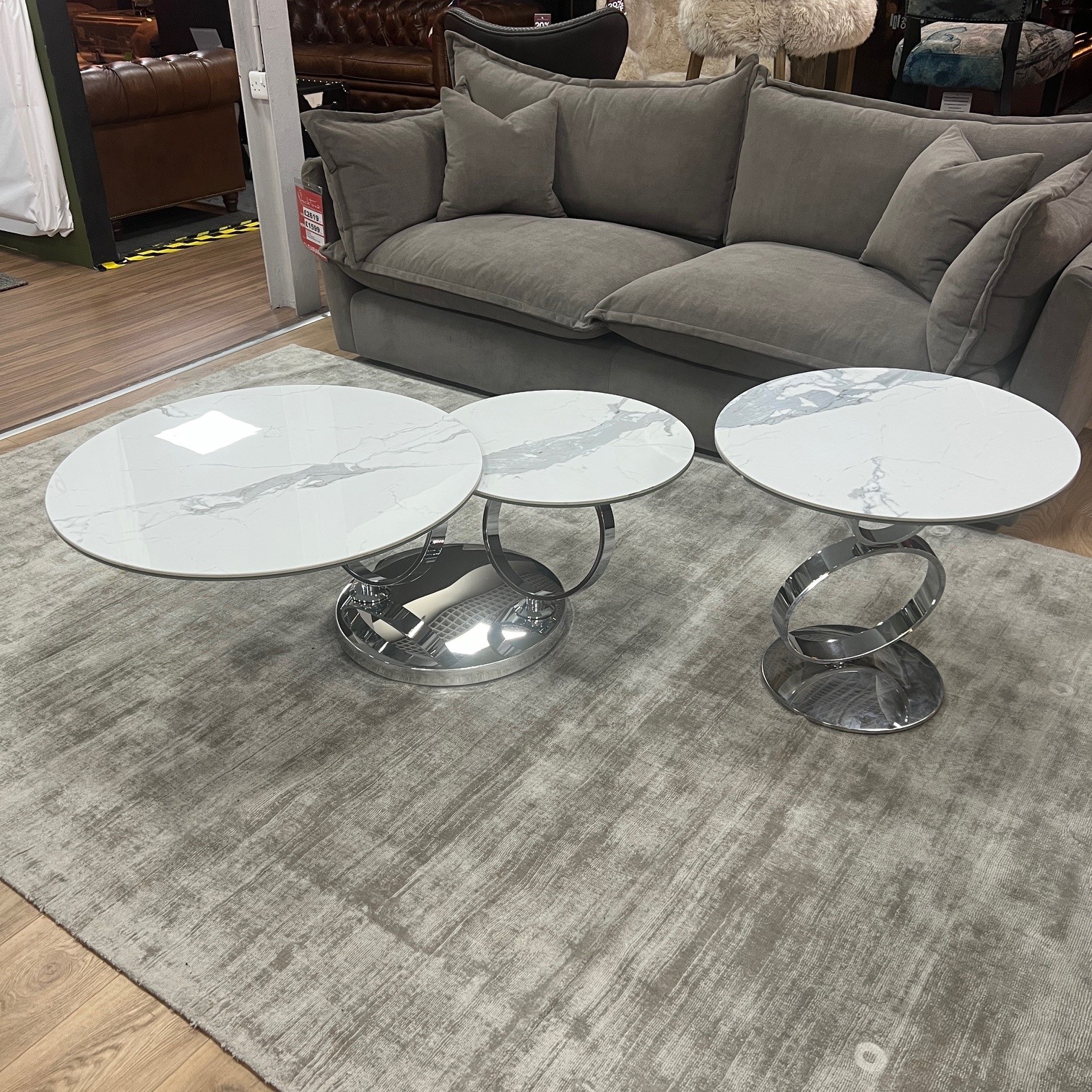 Designed to compliment the Saturn coffee table this piece has an elegant stainless steel base with a stylish white marble effect ceramic top.