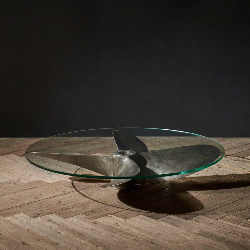Newly available with a round top and 4 leaves, the distinctive Junk Art coffee table features a genuine boat propeller, reclaimed from a Chinese fishing junk, topped with a simple pane of tempered glass. The triple blade propeller, which once roared into life over the seas, lends its history and authenticity to these one of a kind pieces.